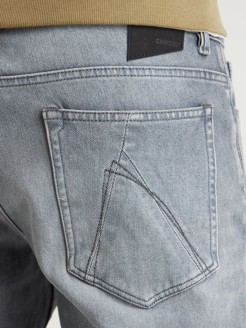 Deze 5-pocket jeans is voorzien van een grijze wassing en een faded worn-in look. Op de achterzakken, zijkant van het bovenbeen en knopen vind je signature CHASIN’ details. Verder is de gulp voorzien van een knoopsluiting.